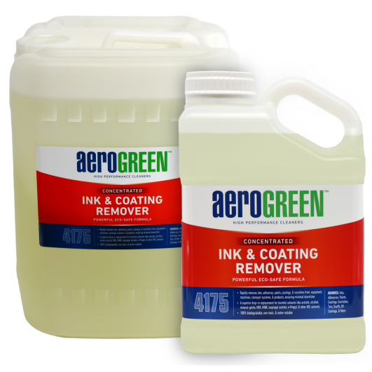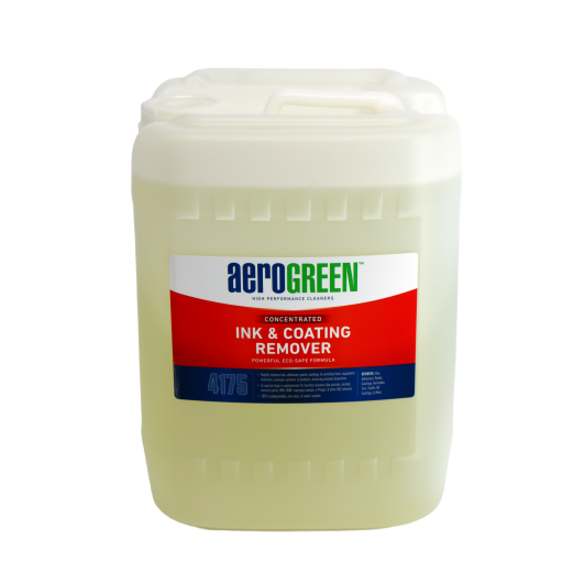 4175 - Ink & Coating Remover is designed to remove ink and various coatings from surfaces. It contains chemicals that break down the molecular bonds of the ink or coating, making it easier to dissolve, soften, or remove through rinsing or wiping. It is 100% readily biodegradable, non-toxic, and water-soluble. By substituting toxic cleaners like acetate/alcohol, mineral spirits, isopropyl acetate, and other VOC solvents with 4175, you not only benefit from its exceptional capabilities as an ink, coating, tar, and adhesive remover but also contribute to environmental protection and ensure the safety of employees. Aerogreen 4175 saves time and money by reducing both the direct and indirect steps and costs associated with solvent applications.